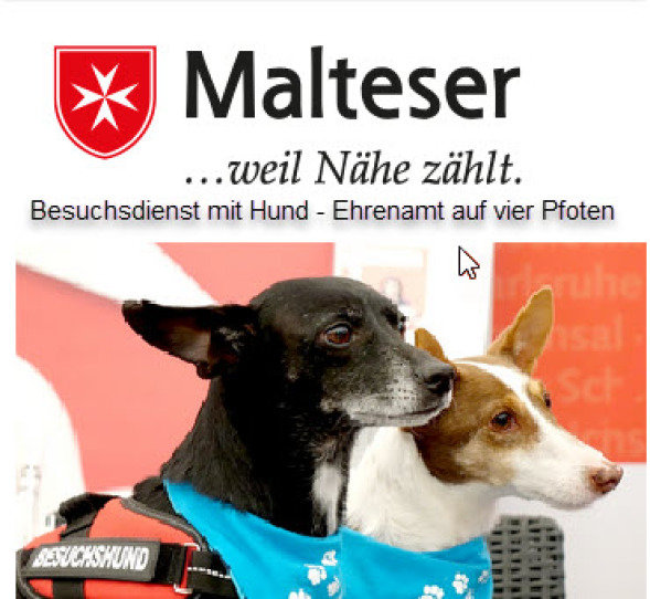 Unsere ausgebildeten Mensch-Hund-Teams aus der Besuchshundegruppe des Malteser Hilfsdienst e.V. in Mannheim besuchen ehrenamtlich soziale Einrichtungen in Mannheim und der Rhein-Neckar-Region, z. B. Seniorenheime, Kindergärten, Schulen, Behindertenwerkstätten etc.